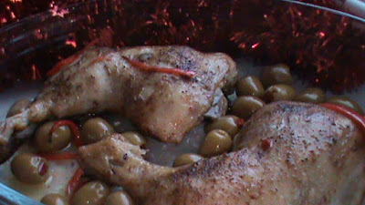 Se aseaza carnea intr-un vas de yena, se pun maslinele si ardeiul rosu taiat bastonase pe lung. Se adauga si lamaia si se toarna in vas cca 100 ml apa.